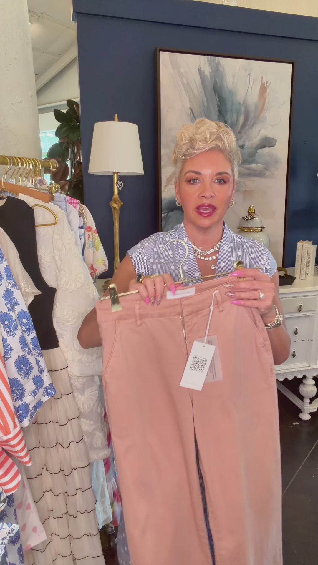 • Blush straight-leg pants with a tailored silhouette