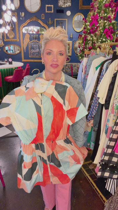 The soft coral, sage, cream, and charcoal geometric pattern gives this collared zip front dress a fresh, elevated feel. The full front zipper allows you to control the neckline, while the structured collar adds just enough sophistication. Short sleeves make it ideal for our warmer climate.