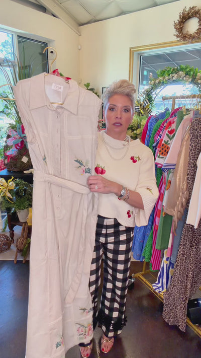 Crafted in a breathable linen blend, this sleeveless button-front jumpsuit features a structured collar, delicate ladder trim detailing, and scalloped edging at the arm openings for a feminine finish. The subtle bird embroidery at the bodice and along the wide leg hem adds an unexpected artisan touch that feels special without being loud. A removable self-tie belt defines the waist, while the wide leg silhouette creates long, fluid lines. On Shannon’s 5’4” frame, the length grazes the top of her foot with a heel, giving that elongated look without overwhelming her height.