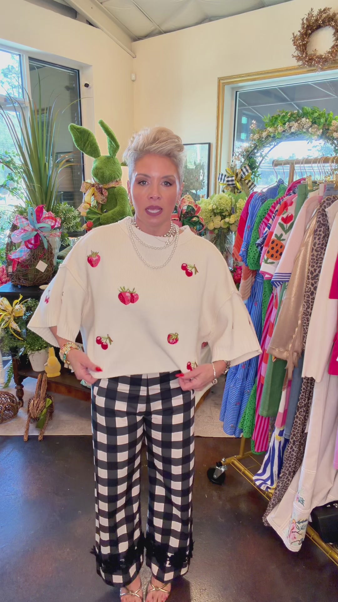 Designed in a soft, lightweight knit, this fruit embroidered short sleeve sweater features scattered cherries and strawberries stitched across a creamy neutral base. The embroidery gives beautiful texture and dimension without feeling bulky. The silhouette is relaxed with a slightly boxy drape, balanced by elbow-length sleeves and clean ribbed trim at the neckline and hem. It is easy to half-tuck, front-tuck, or wear loose depending on your styling mood.
