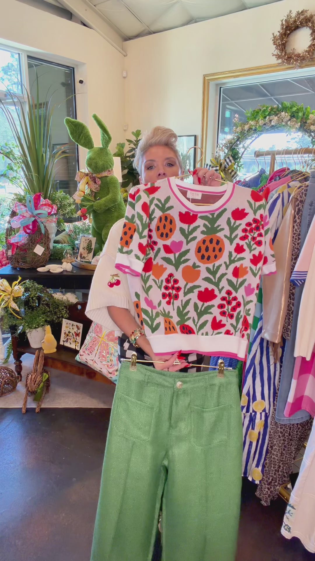 Joy in sweater form. This floral fruit print short sleeve sweater is bold, colorful, and impossible to ignore in the very best way. It feels like spring decided to dress up and go somewhere fabulous.