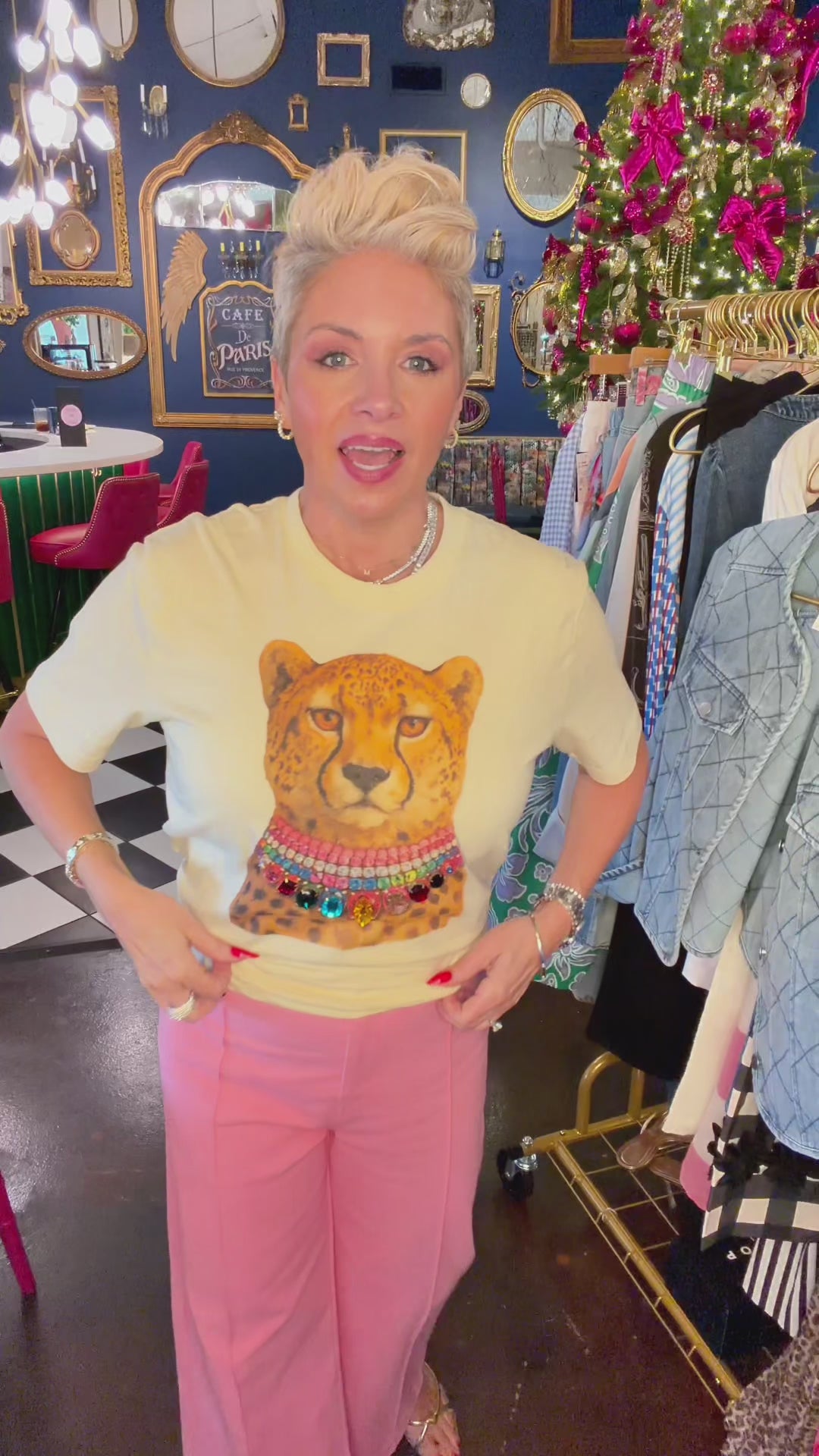 If you’ve been searching for a statement graphic tee for women that feels elevated instead of casual, this one brings the drama in the best way. The bold cheetah print paired with vibrant jeweled detail gives this classic tee a luxe, fashion-forward twist.