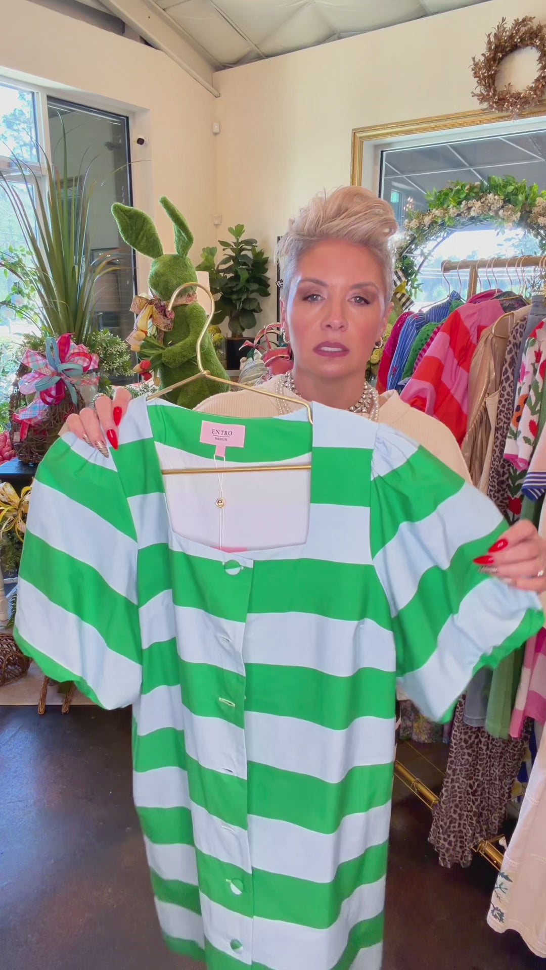 Green stripes have a way of turning heads before you even say a word. Searching for a bold striped mini dress that’s polished enough for lunch but playful enough for spring events? This one makes the statement for you.