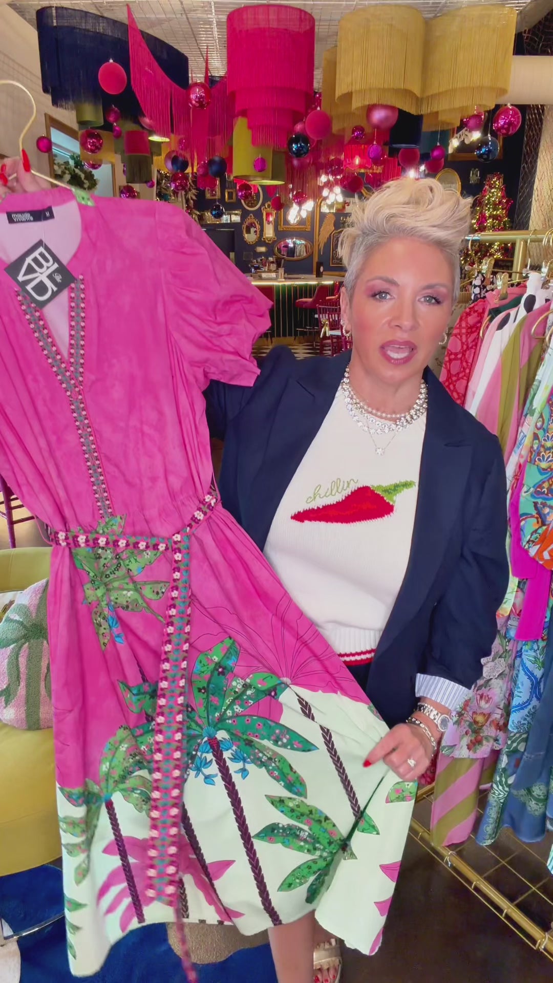 Bold color, playful print, and effortless polish all come together in this pink tropical palm print midi dress. The vibrant pink bodice instantly brightens your look, while the striking palm tree and botanical print skirt adds personality and movement. A delicate contrast trim along the neckline and placket brings a fun pop of pattern, tying beautifully into the coordinating self-tie belt that defines the waist and adds an extra styling detail.