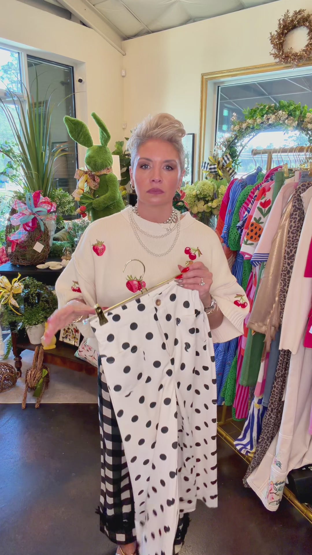 The wide leg cut flows gracefully while the bold polka dot print keeps it playful yet sophisticated.
