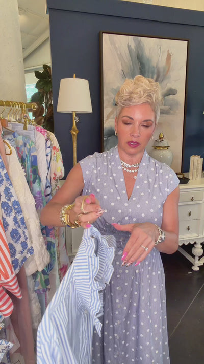 A classic stripe gets a playful upgrade in this blue and white striped ruffle blouse, a piece that feels both timeless and fresh. The crisp vertical stripes give it that polished, tailored look while the feminine details bring just the right amount of charm.