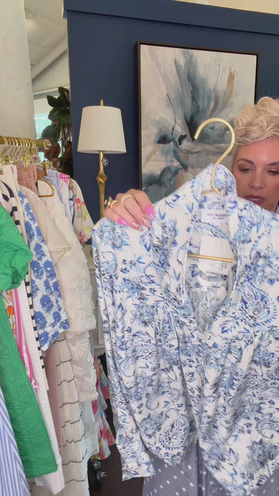 Classic blue and white never goes out of style, and this blue floral blouse brings a fresh, elevated twist to the timeless palette. The delicate paisley-inspired floral pattern gives the piece a soft, romantic feel while still keeping the look crisp and polished.