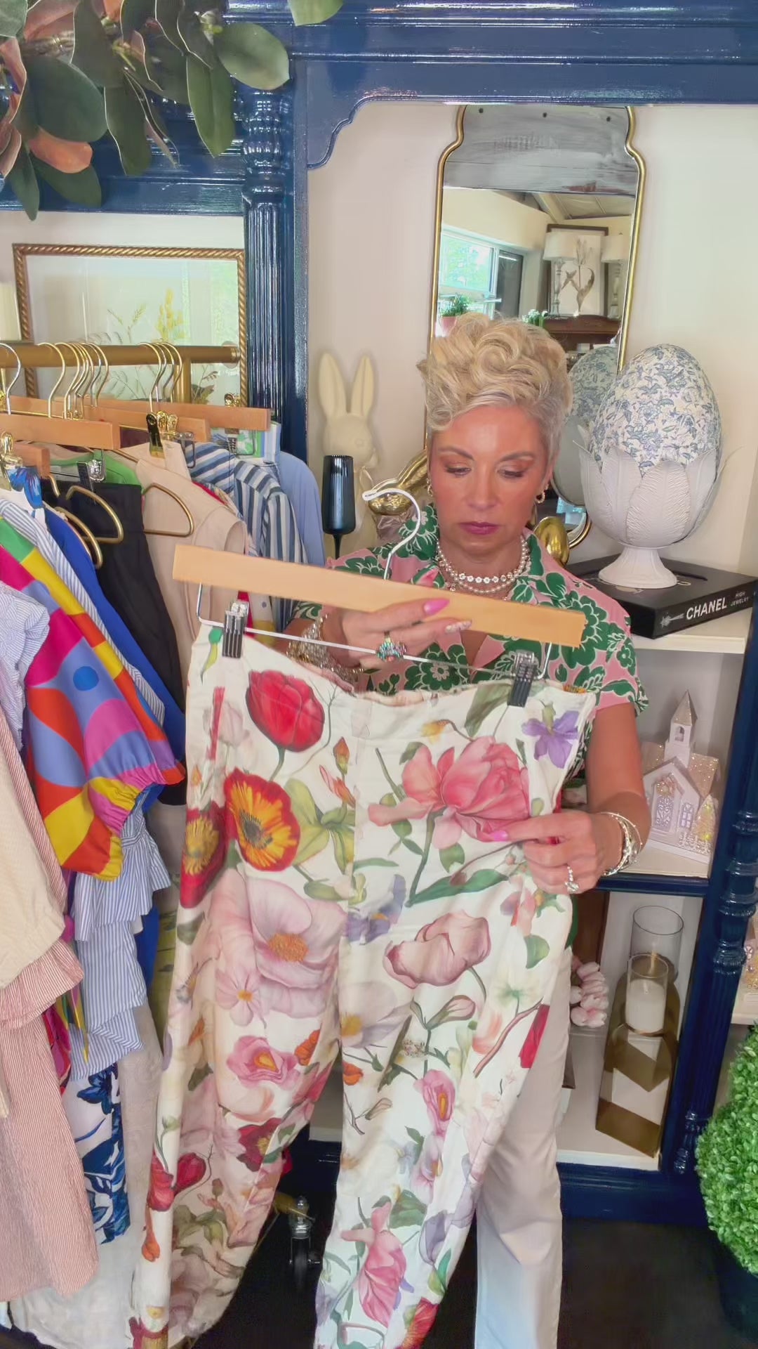 These Vilagallo floral wide leg pants are truly a statement piece but still very wearable because of the soft color palette. The floral print has beautiful shades of red, coral, pink, green, and soft neutrals, which makes them easy to pair with many different tops.
