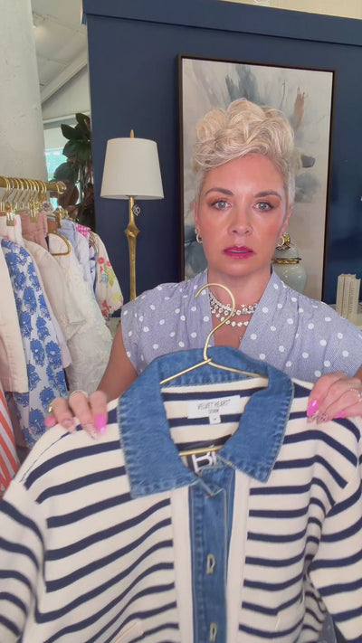 A classic stripe always finds its way into a well-edited wardrobe, and this striped knit cardigan with denim trim delivers a fresh, modern twist on a timeless look. The navy and cream stripes feel crisp and coastal, while the unexpected denim collar and placket detail add a relaxed, layered look without the bulk of multiple pieces.